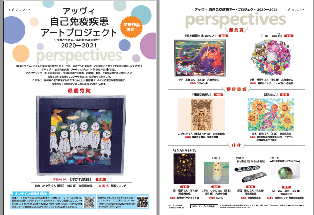 アッヴィ アートプロジェクト事務局(共和ピー・アール株式会社)よりお知らせ アートプロジェクト「PERSPECTIVES」 を通じて、「PERSPECTIVES」の目的である、 多くの方に向けて疾患について知っていただくきっかけを作り、 さらなる患者さんへの理解促進につなげてまいりたいと考えております。 今後とも引き続き、ご協力をお願い申し上げます。 応募資格 ● 免疫介在性炎症性疾患(関節リウマチ・若年性特発性関節炎・ 強直性脊椎炎・尋常性乾癬・乾癬性関節炎・ 膿疱性乾癬・クローン病・潰瘍性大腸炎・ 腸管型ベーチェット病・非感染性ぶどう膜炎・化膿性汗腺炎・ アトピー性皮膚炎、シェーグレン症候群、全身性エリテマトーデスなど) をもつ患者さん ● 日本在住の方 ● 応募された作品が、テレビや各種媒体で紹介されることに同意いただける方 ● 応募規約に同意いただける方 アートプロジェクトHP